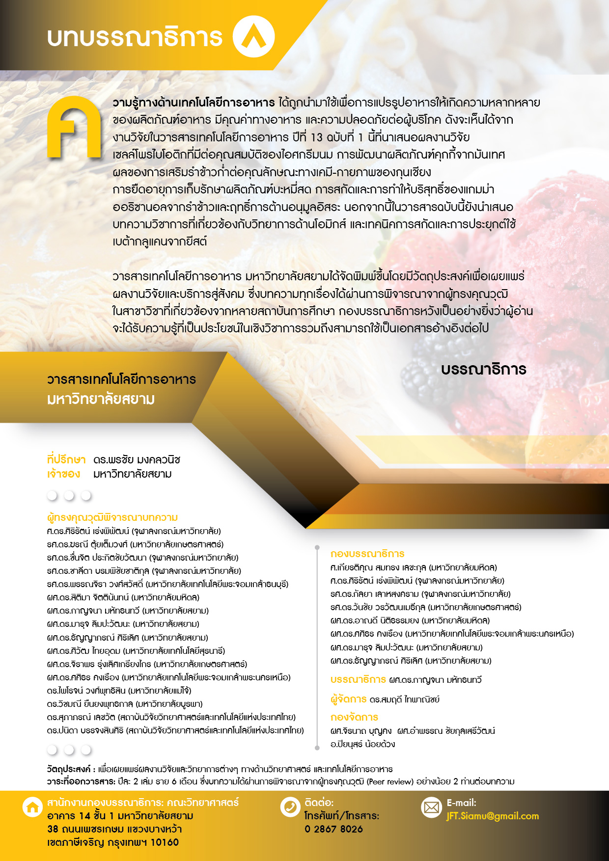 วารสารเทคโนโลยีการอาหาร มหาวิทยาลัยสยาม (JOURNAL OF FOOD TECHNOLOGY, SIAM UNIVERSITY) ในรูปแบบตีพิมพ์ ISSN 1686-3070 (Print) ได้จัดทำฉบับแรกขึ้น ใน ปี พ.ศ. 2547 (ฉบับที่ 1) โดยการดำเนินงานของคณะวิทยาศาสตร์ มหาวิทยาลัยสยาม ต่อมาได้เริ่มจัดทำวารสารในรูปแบบอิเล็กทรอนิกส์ ISSN 2651-1169 (Online) เพื่อเผยแพร่ผ่านระบบฐานข้อมูลวารสารอิเล็กทรอนิกส์กลางของประเทศไทย (Thai Jounals Online (ThaiJO)) โดยมีวัตถุประสงค์เพื่อเผยแพร่งานวิจัยด้านเทคโนโลยีการอาหารและศาสตร์ที่เกี่ยวข้อง เช่น โภชนาการ และเทคโนโลยีหลังการเก็บเกี่ยว เป็นต้น เพื่อบริการวิชาการแก่สังคม ซึ่งมีวาระการออกปีละ 2 ฉบับ ฉบับที่ 1 มกราคม-มิถุนายน และฉบับที่ 2 กรกฎาคม-ธันวาคม