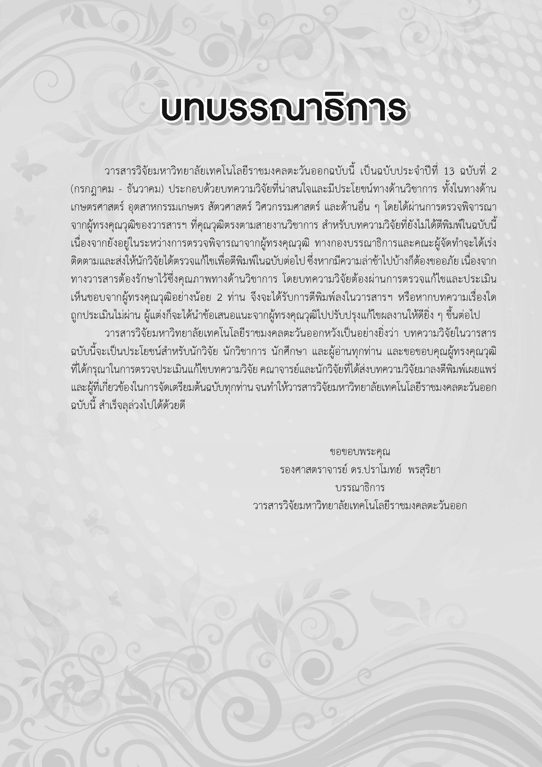 วารสารวิจัยมหาวิทยาลัยเทคโนโลยีราชมงคลตะวันออกฉบับนี้ เป็นฉบับประจำปีที่ 13 ฉบับที่ 2(กรกฎาคม - ธันวาคม) ประกอบด้วย บทความวิจัยที่น่าสนใจและมีประโยชน์ทางด้านวิชาการ ทั้งในทางด้านเกษตรศาสตร์อุตสาหกรรมเกษตร สัตวศาสตร์วิศวกรรมศาสตร์และด้านอื่น ๆ โดยได้ผ่านการตรวจพิจารณาจากผู้ทรงคุณวุฒิของวารสารฯ ที่คุณวุฒิตรงตามสายงานวิชาการ สำหรับบทความวิจัยที่ยังไม่ได้ตีพิมพ์ในฉบับนี้ เนื่องจากยังอยู่ในระหว่างการตรวจพิจารณาจากผู้ทรงคุณวุฒิทางกองบรรณาธิการและคณะผู้จัดทำจะได้เร่งติดตามและส่งให้นักวิจัยได้ตรวจแก้ไขเพื่อตีพิมพ์ในฉบับต่อไป ซึ่งหากมีความล่าช้าไปบ้างก็ต้องขออภัย เนื่องจากทางวารสารต้องรักษาไว้ซึ่งคุณภาพทางด้านวิชาการ โดยบทความวิจัยต้องผ่านการตรวจแก้ไขและประเมินเห็นชอบจากผู้ทรงคุณวุฒิอย่างน้อย 2 ท่าน จึงจะได้รับการตีพิมพ์ลงในวารสารฯ หรือหากบทความเรื่องใดถูกประเมินไม่ผ่าน ผู้แต่งก็จะได้นำข้อเสนอแนะจากผู้ทรงคุณวุฒิไปปรับปรุงแก้ไขผลงานให้ดียิ่ง ๆ ขึ้นต่อไป